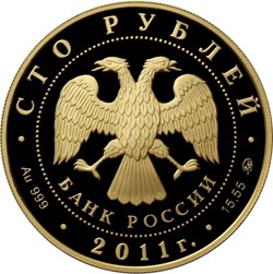 в центре диска - эмблема Банка России (двуглавый орел с опущенными крыльями, под ним - надпись полукругом "БАНК РОССИИ"), обрамленная кругом из точек и надписями по кругу - вверху: "СТО РУБЛЕЙ", внизу: слева - обозначения драгоценного металла и пробы сплава, в центре - дата выпуска "2011 г.", справа - содержание химически чистого металла и товарный знак монетного двора.